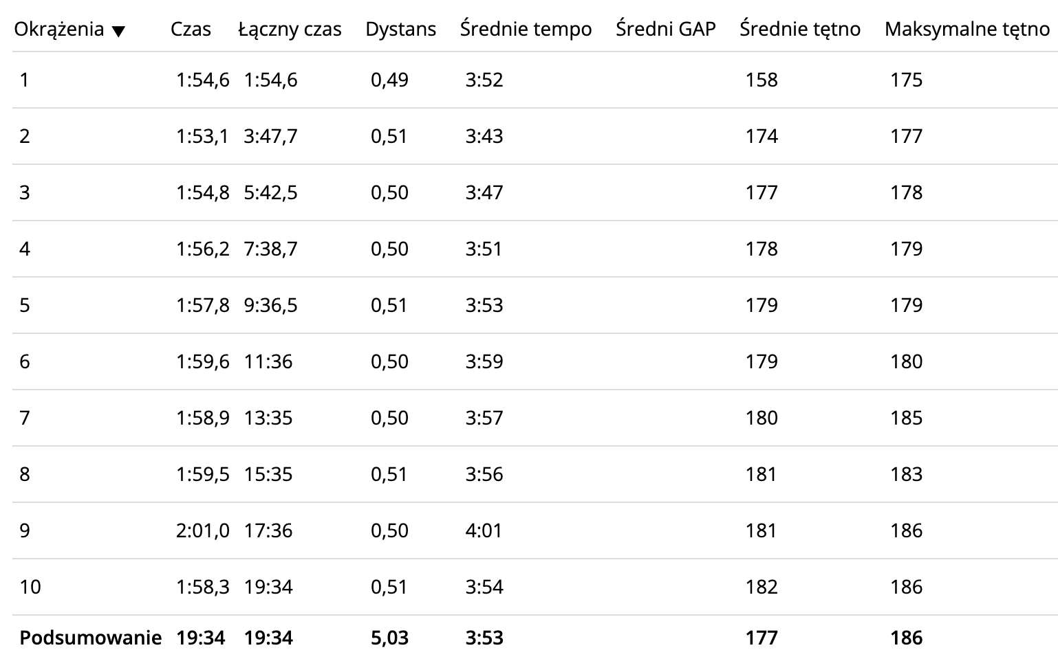 Trochę jednak dałem radę przyspieszyć bo widzę tempo średnie wzrosło do 5:06/km i na metę wbiegłem z czasem: